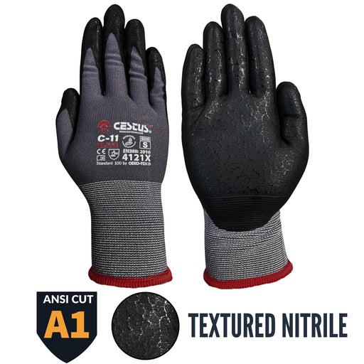 Model C11e For precision handling and general operations. ANSI cut A1 ANSI abrasion 4 ANSI puncture 2 Foam nitrile coating with raised texture 15...