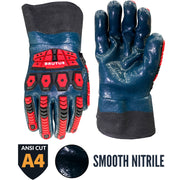Wide cuff nitrile coated impact gloves with a 360 cut-resistant liner.
