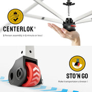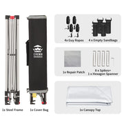 10 x 10 ft. vented tent with weighted sandbag legs.